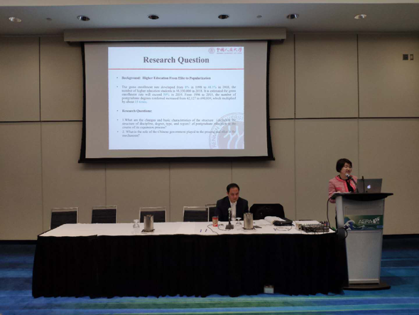 会议期间,我院研究团队分别在三场主题论坛上进行论文汇报。李立国教授、胡娟教授在“高等教育社会、文化与变化(Postsecondary Education Society, Culture and Change)”论坛上发言,该论坛的主题为“中国高等教育公平与社会正义(Analyzing Equality and Social Justice in Higher Education in China)”,论坛主持人为加拿大约克大学教授Qiang Zha以及美国南加利福尼亚大学教授William G. Tierney。论坛上,Qiang Zha教授探讨了以区域差异为中心的后大众化时代中国高等教育中的平等与公平问题,来自清华大学的Fei Guo教授汇报了中国高等教育成就中的性别差异,而来自香港大学的Yunyun Qin教授从学术、社会和职业成功的决定因素探讨中国精英大学农村学生的最后一年表现。