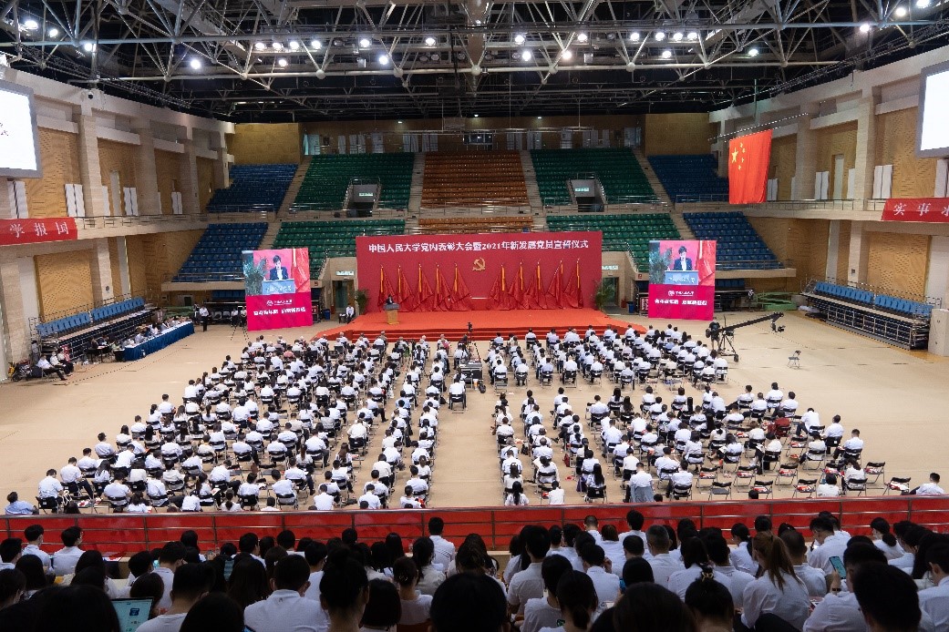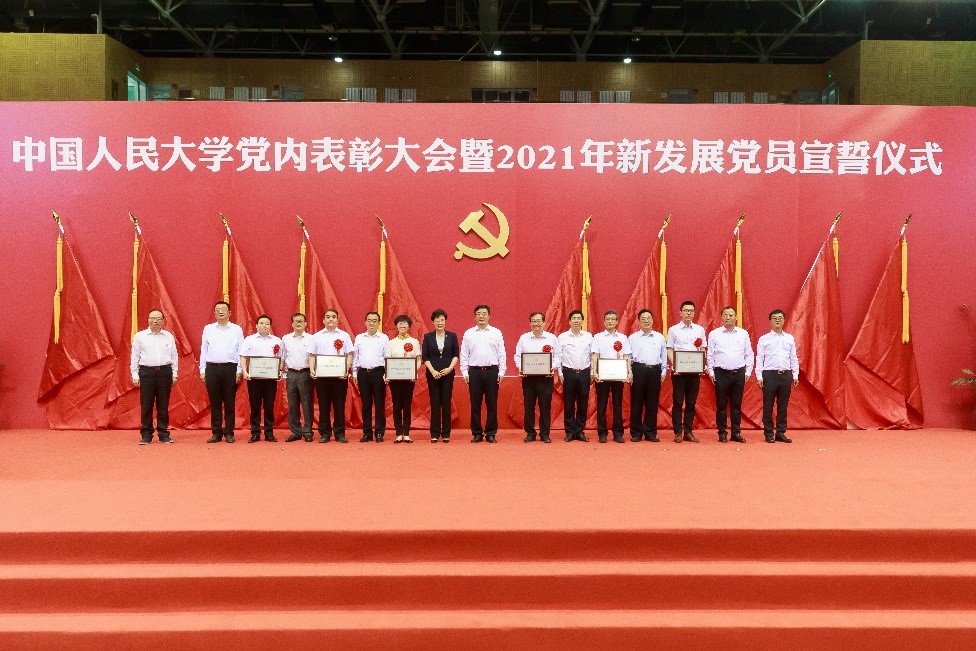 6月28日下午,中国人民大学举行党内表彰大会暨2021年新发展党员宣誓仪式。全体在校校领导靳诺、刘伟、吴付来、郑水泉、刘元春、朱信凯、齐鹏飞、顾涛、王轶、胡百精出席会议。党委副书记、校长刘伟主持会议。