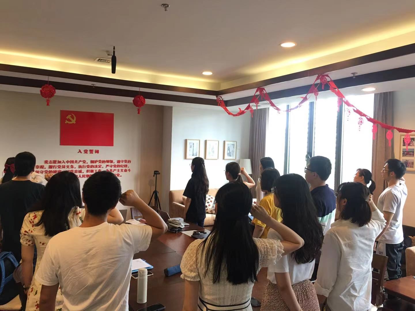 会议最后,面对庄严的党旗,全体党员高举右拳,重温入党誓词。
