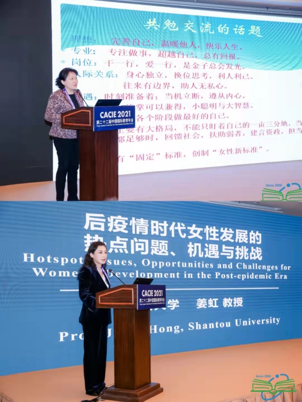 姜虹以“后疫情时代女性发展的热点问题、机遇与挑战”为题发言,阐述了后疫情背景之下,女性发展的热点问题所展现出的女性的优势与劣势,并且从国家与社会、企业与组织、家庭和个人、学校四个层面探讨了女性如何抓住机遇,迎接挑战。姜虹以汕头大学女性教育的探索与实践为例,指出高质量教育体系应达到增强女生自我认知、提升女性领导力和责任担当意识的效果。
