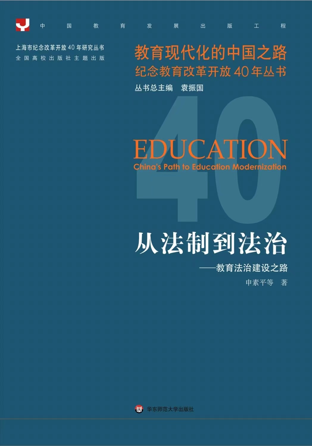 《从法制到法治——教育法治建设之路》一书,由申素平教授领衔的团队合著,于2018年7月由华东师范大学出版社出版,是我国第一部也是迄今唯一一部系统总结改革开放以来教育法治四十年建设史的学术著作,曾于2019年荣获中国人民大学年度优秀科研成果奖。该书也是上海市哲学社会科学规划办、上海市哲学社会科学学术话语办“纪念改革开放40周年研究重点项目”系列丛书“教育现代化的中国之路:纪念教育改革开放40年丛书(共10册)”之一,入选2018年国家社科基金中华学术外译项目,正由瑞士兰培德(Peter Lang)国际学术出版集团纽约分社出版英译本。