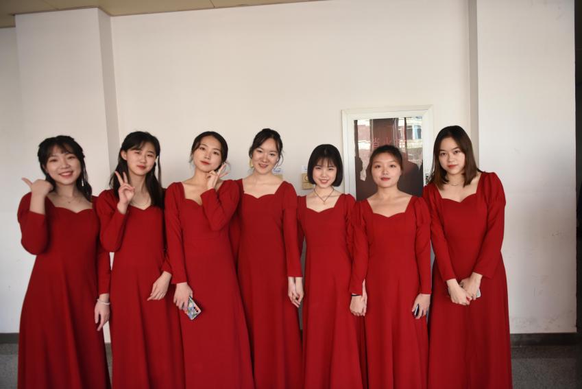 参赛师生在明德国际楼307教室备场,女生一袭红裙明艳动人,男生一身西装英姿飒爽,妆容要精致、衣着要整齐,比赛在即,参赛选手们积极筹备、紧张有序。