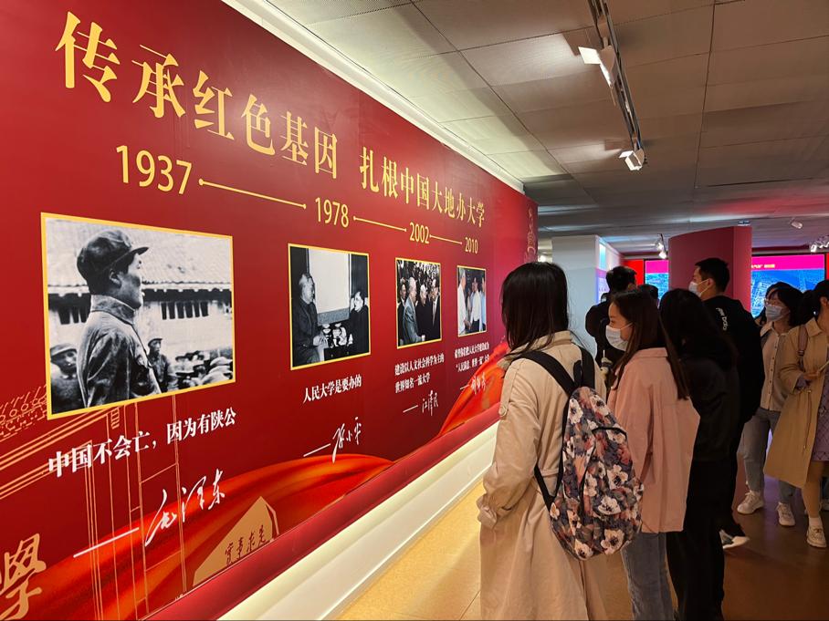 同学们在校史馆认真学习了习近平总书记到中国人民大学调研考察时发表的重要讲话。习近平强调,中国人民大学在抗日烽火中诞生,在党的关怀下发展壮大,具有光荣的革命传统和鲜明的红色基因。一定要把这一光荣传统和红色基因传承好,守好党的这块重要阵地。要加强校史资料的挖掘、整理和研究,讲好中国共产党的故事,讲好党创办人民大学的故事,激励广大师生继承优良传统,赓续红色血脉。