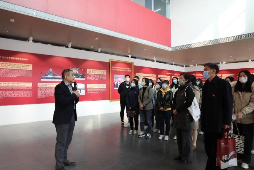 在1号展厅,党员们观看了“深入学习习近平总书记在中国人民大学考察时重要讲话精神”“沿着习近平总书记指引的建设中国特色世界一流大学‘新路’奋勇前行”“五学联动引领学习新风尚,将‘独树一帜’写入新时代奋进的辉煌篇章”等展板内容,从思政课建设、挖掘校史资源、教师队伍建设、红色文献保护与古籍研究、立德树人、自主知识体系建构、师德师风、寄语青年等八个方面,深入学习了习近平总书记4月25日在中国人民大学考察调研时的重要讲话精神。