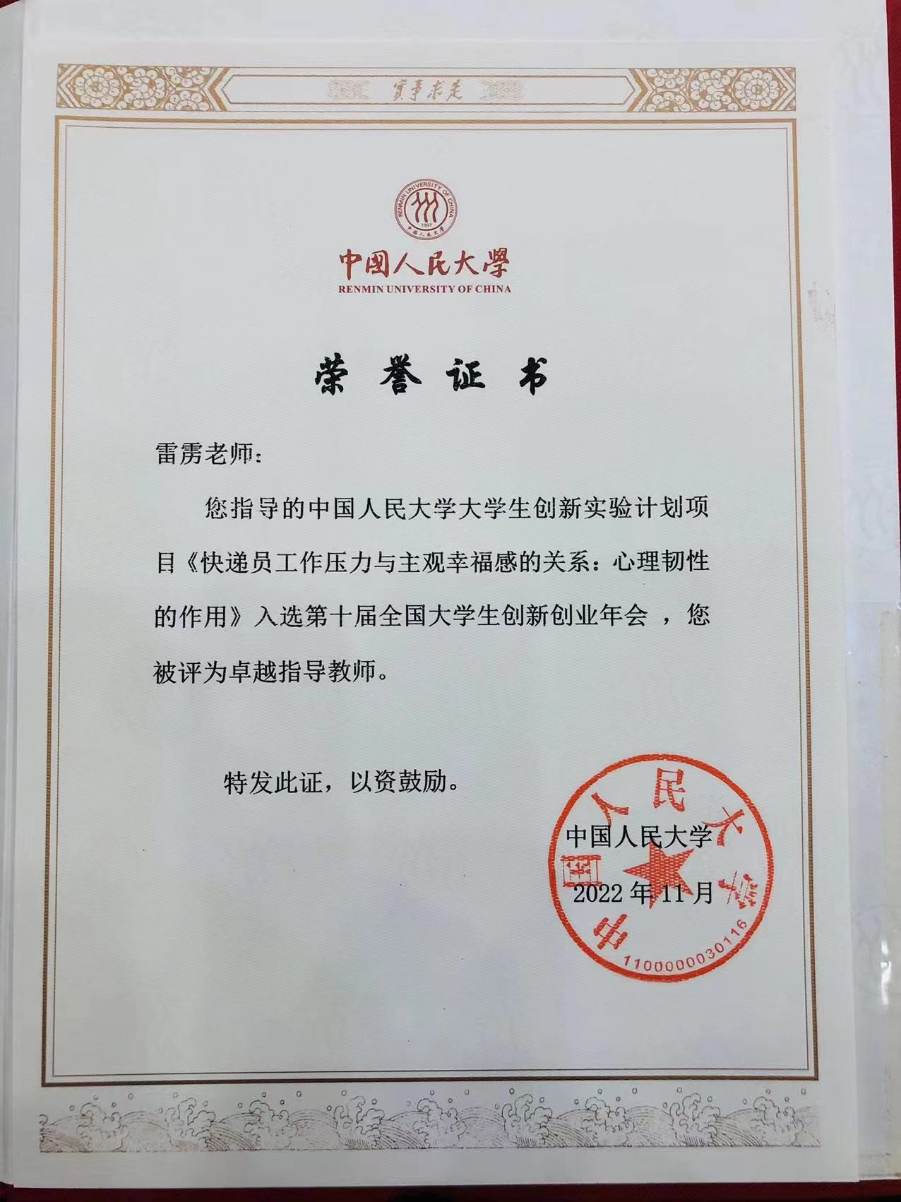 我院雷雳教授指导的中国人民大学生创新实验计划项目《快递员工作压力与主观幸福感的关系:心理韧性的作用》入选第十届全国大学生创新创业年会,在本次“大创计划”十五周年总结表彰中,雷雳教授获评“卓越指导教师”称号。