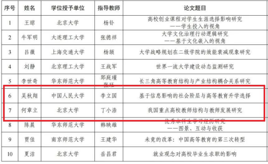 中国高等教育学会于2022年11月14日公布“中国高等教育学会学术创新计划——高等教育学博士学位论文文库”入库名单,我院青年教师、2021届博士毕业生吴秋翔博士学位论文《基于信息影响的社会阶层与高等教育升学选择》、2017届硕士毕业生何章立博士学位论文《我国重点高校教师结构与教师发展研究》入选。