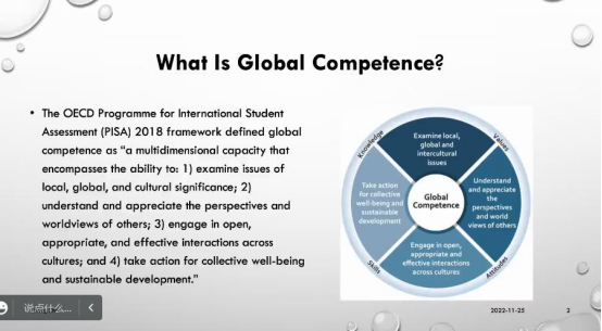 查强博士从全球胜任力的定义出发,对经合组织(OECD)2018年实施的国际学生评估项目(PISA)、亚洲协会、加拿大教育部长理事会(CMEC)对全球胜任力的定义出发,梳理了其包含全球视野、跨文化交流、创新创造、可持续发展等内涵,并提出了独特的理解与观察,如重视行动、从强调知识到强调技能、国际性向全球性转变。