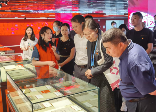 在博物馆入口处参观中国人民大学新校区模型后,参与师生党员一行来到吴玉章生平展展区。展览分为“革命先驱”和“师表典范”两大版块,具体展现吴玉章老校长从“从同盟会到辛亥首义”“从新民主主义者到坚定的共产主义者”“留学教育与强国梦”“创办高等教育的探索”“中国人民大学首任校长17年”“文字改革和推广普通话历史研究”“淳朴家风”等多方面的殊勋茂绩与伟大风范。在讲解员的引导下,师生党员集体观摩了吴玉章老校长的手稿、藏书、衣物、生活用品与纪念品等287件珍贵实物,一一了解其背后的动人故事。张晓京与讲解员及参与党员交流分享观展感想。