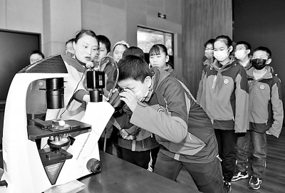 在安徽省合肥市六安路小学,中科院合肥物质研究院研究员黄瑞(左一)为学生介绍显微镜使用方法。葛传红摄/光明图片