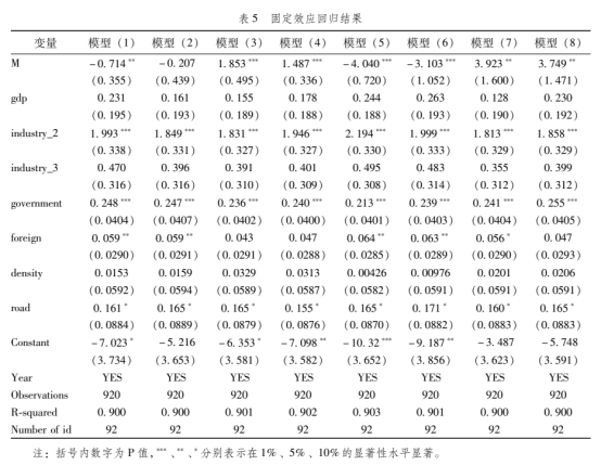 在规模分布方面,模型(1)(2)中高校数量q值的回归系数显著为负,高等教育数量资源单中心分布对城市群创新能力具有负向影响,高校数量q值每增加1%,区域创新能力降低0.71%;模型(3)(4)中高校高级职称教师数与高校科技课题总数q值的回归系数显著为正,高校高级职称教师数q值每增加1%,区域创新能力提升1.85%;高校科技课题总数q值每增加1%,区域创新能力提升1.49%。高等教育质量资源单中心分布对城市群创新能力具有正向影响。在空间集聚方面,模型(5)(6)中高校数量与高校在校学生数区位基尼系数的回归系数显著为负,高校数量的区位基尼系数每增加1%,区域创新能力降低4.04%;高校在校学生数的区位基尼系数每增加1%,区域创新能力降低3.10%。高等教育数量资源集聚对城市群创新能力具有显著抑制作用。模型(7)(8)高校高级职称教师数与高校科技课题总数区位基尼系数的回归系数显著为负,高校高级职称教师数的区位基尼系数每增加1%,区域创新能力提升3.92%;高校在校学生数的区位基尼系数每增加1%,区域创新能力提升3.75%。高等教育质量资源集聚对城市群创新能力具有显著促进作用。
