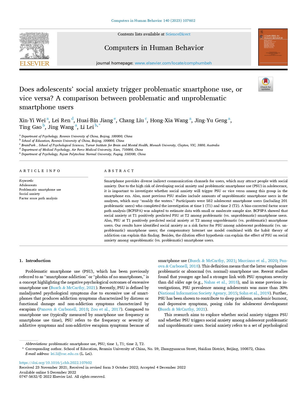 ABSTRACT:Smartphone provides diverse indirect communication channels for users, which may attract people with social anxiety. Due to the high risk of developing social anxiety and problematic smartphone use (PSU) in adolescence,it is important to investigate whether social anxiety will trigger PSU or vice versa among this group in the smartphone era. Also, most previous PSU studies include amounts of unproblematic smartphone users in the analyses, which may“muddy the waters.”Participants were 582 adolescent smartphone users (including 201 problematic users) who completed the investigation at time 1 (T1) and time 2 (T2). A bias-corrected factor score path analysis (BCFSPA) was adopted to estimate data with small or moderate sample size. BCFSPA showed that social anxiety at T1 positively predicted PSU at T2 among problematic (vs. unproblematic) smartphone users.Also, PSU at T1 positively predicted social anxiety at T2 among unproblematic (vs. problematic) smartphone users. Our results have identified social anxiety as a risk factor for PSU among adolescent problematic (vs. unproblematic) smartphone users; the compensatory Internet use model combined with the habit theory of addiction can explain this finding. Besides, the dilution effect hypothesis can explain the effect of PSU on social anxiety among unproblematic (vs. problematic) smartphone users.