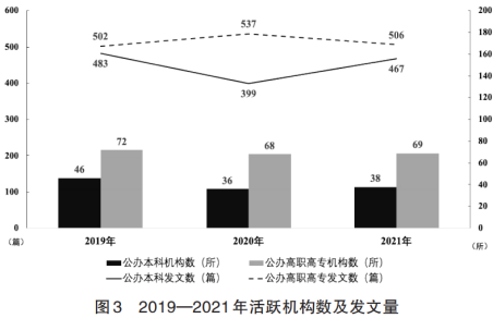 2. 活跃机构发文情况对比分析。在学术研究场域中,研究机构是最为基本的单位,处于优势地位的研究机构可以为研究者提供丰富的研究资源和交流机会,主导形成主流研究范式,并进而影响研究者群体的研究行为。综合回顾2019—2021年的活跃机构发文情况,虽发文数量和机构数量出现一定程度的波动,但数量占比和发文占比都保持了相对的稳定性,显示出活跃机构稳定程度的上升和职业教育研究生态整体成熟度的提高。(见图2、图3)