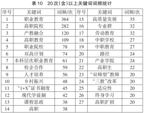 关键词共现分析基于关键词词频,通过高频关键词确定该领域的研究热点,通过共现图谱的连接关系确定其紧密程度。运用词频统计工具对1808篇论文关键词进行处理和统计分析,共提取7440个关键词,篇均4.12个,其中独立出现的关键词有3542个。对“高等职业教育”与“高职教育”、“中职学校”与“中等职业学校”等内涵相同的关键词进行合并,最终得出关键词词频统计结果,表10列举了重复20次及以上的关键词。