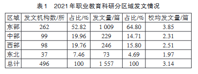 具体到高等教育机构参与职业教育科研的活跃度,东部地区明显高于其他区域,共有占东部地区全部高校25.34%的学校发文,中部、西部、东北地区的占比大致相当,分别为13.69%、13.26%、14.23%。