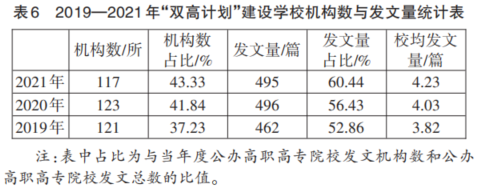 4. “双高计划”建设学校发文情况对比。如表6所示,近3年来发文的“双高计划”建设学校机构数和发文量保持了相对稳定;机构数占比和发文量占比都呈现出了稳定增长趋势,显示出作为职业教育发展的主力军和领头雁,“双高计划”建设学校在职业教育科研场域的活跃程度不断提升,并借助科研活动积极建构在新时代职业教育发展中的话语主导权。