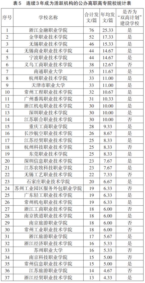 3. 连续发文活跃机构情况对比分析。从时间维度上考察,将连续3年发文4篇(含)以上的机构归类为职业教育研究活跃机构。2019—2021年连续发文4篇(含)以上的公办本科院校共25所,分别占到2019—2021年度公办本科院校活跃机构数量的54.35%、69.44%、65.79%。(见表4)2019—2021年连续发文4篇(含)以上的公办高职高专院校共37所,分别占2019—2021年度公办高职高专院校活跃机构数量的51.39%、54.41%、53.62%。(见表5)这显示了连续活跃机构已经占据了职业教育科研贡献版图的核心位置且地位稳固。