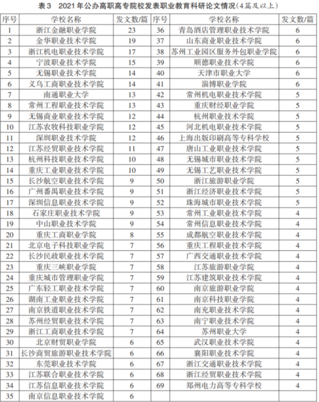 根据机构发文数量的分布情况,本研究将发文4篇(含)以上的机构归类为职业教育研究发文活跃机构。2021年公办本科院校发文4篇(含)以上的有38所,共发文467篇,占同类发文机构总数的20.54%和同类机构发文总量的68.48%。(见表2)其中,15所“双一流”建设高校共发文213篇,占比45.61%。2021年公办高职高专院校发文4篇(含)以上的发文活跃机构有69所,共发文506篇,分别占同类发文机构总数的25.56%和同类机构发文总量的61.78%。(见表3)其中,47所“双高计划”建设学校共发文379篇,占比74.90%。