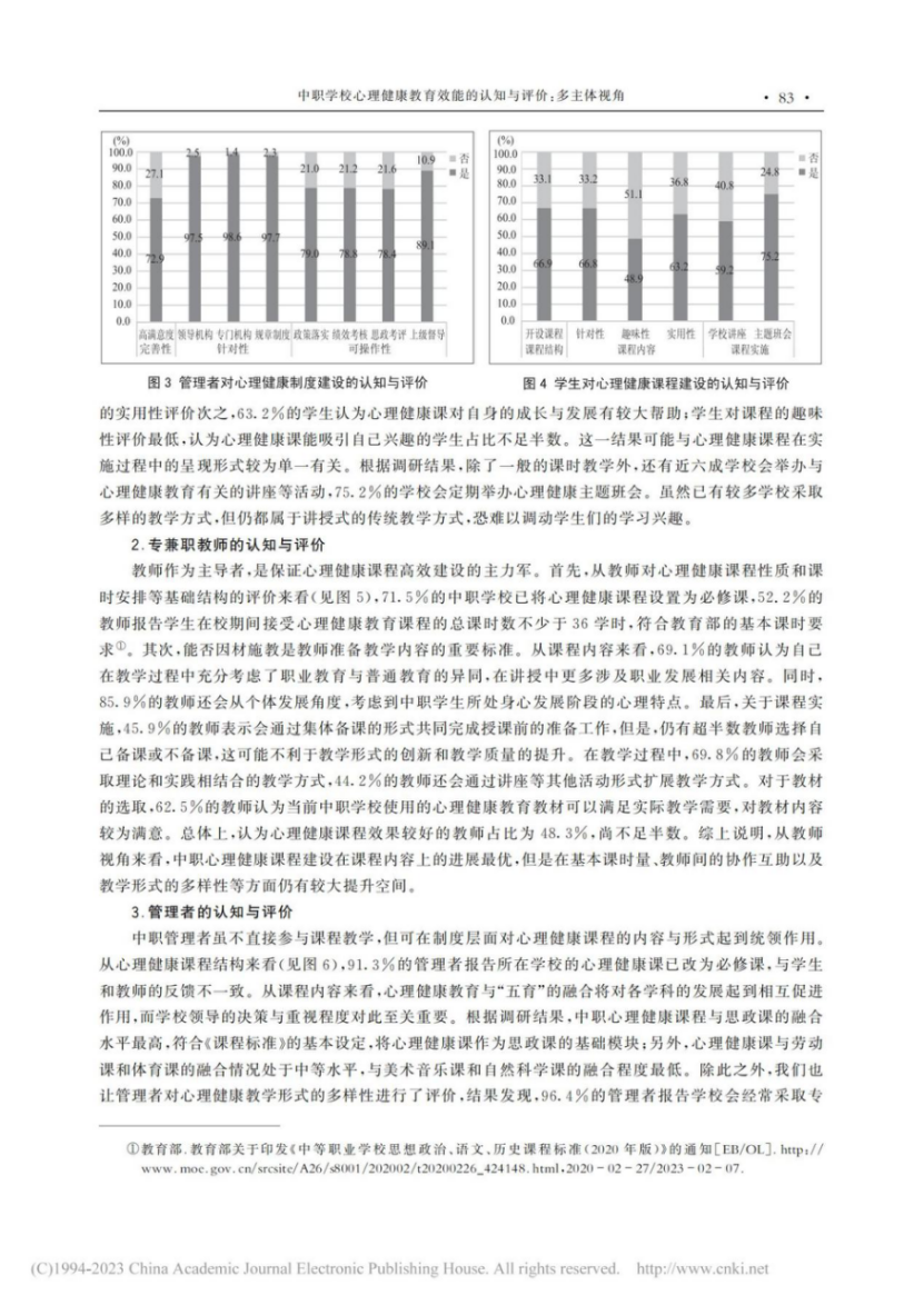 [摘 要]为全方位了解中职学校心理健康教育效能的发展现状,我们对全国20个省市的82所中职学校的62632名中职学生、1714名专兼职教师和439名管理者进行了问卷调查,比较了学生、教师和管理者三个主体在制度建设、课程建设、机构建设和师资队伍建设四大要素上对心理健康教育效能的认知与评价。结果发现:(1)在制度建设上,管理者的评价明显优于学生和教师,但三个主体均认为心理健康制度建设的水平较低;(2)在课程建设上,表示学校已开设心理健康课程的学生和教师比例均低于管理者约二成,对教学形式多样性评价较高的教师占比为44.2%,管理者占比为96.4%;(3)在机构建设上,三个主体的评价基本一致,认为学校设置心理咨询室等基础设施的主体比例约为八至九成,认为心理辅导与咨询效果良好的占比为七成左右;(4)在师资队伍建设上,约有七成左右的学生和管理者对心理健康教师的专业能力给予较高评价,明显高于教师的自我评价,但心理健康教师的晋升机会在教师和管理者的评价中均处于最低位。由此说明,不同主体对学校心理健康教育效能的评价存在出入,分析主体间的认知差异将有助于发现问题,提升效能。未来中职学校心理健康教育工作应大力促进不同主体与要素间的最优配合,突出管理者在制度建设上的领导力优势,积极听取学生和教师的需求与建议;促进学生与教师在课程教学中的相互协作,学生善学,教师善教;深化心理健康机构的内在目标,追求教育效果提升而非硬件基础设备;鼓励教师把握培训机会,关注自身专业成长,内外兼修。